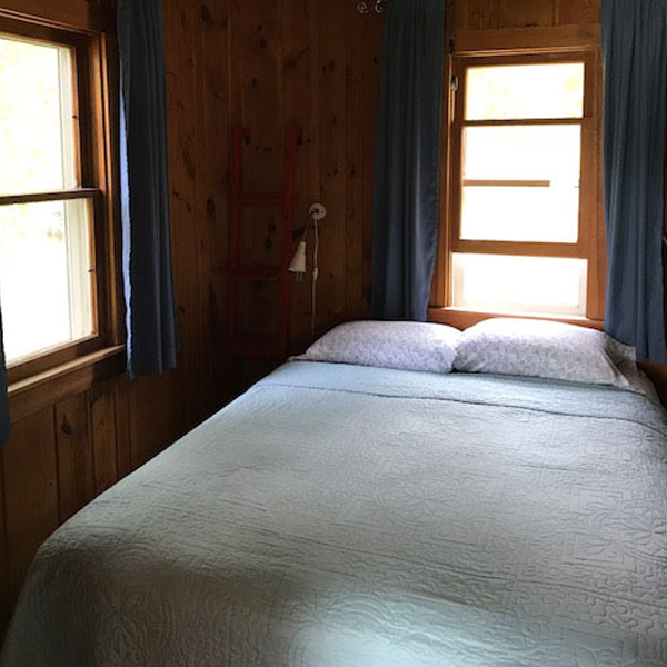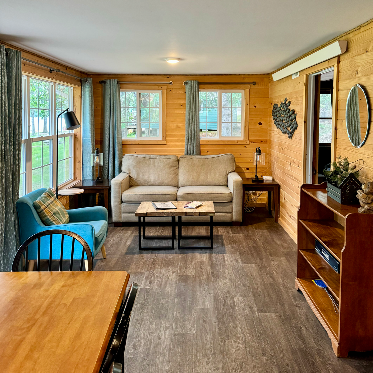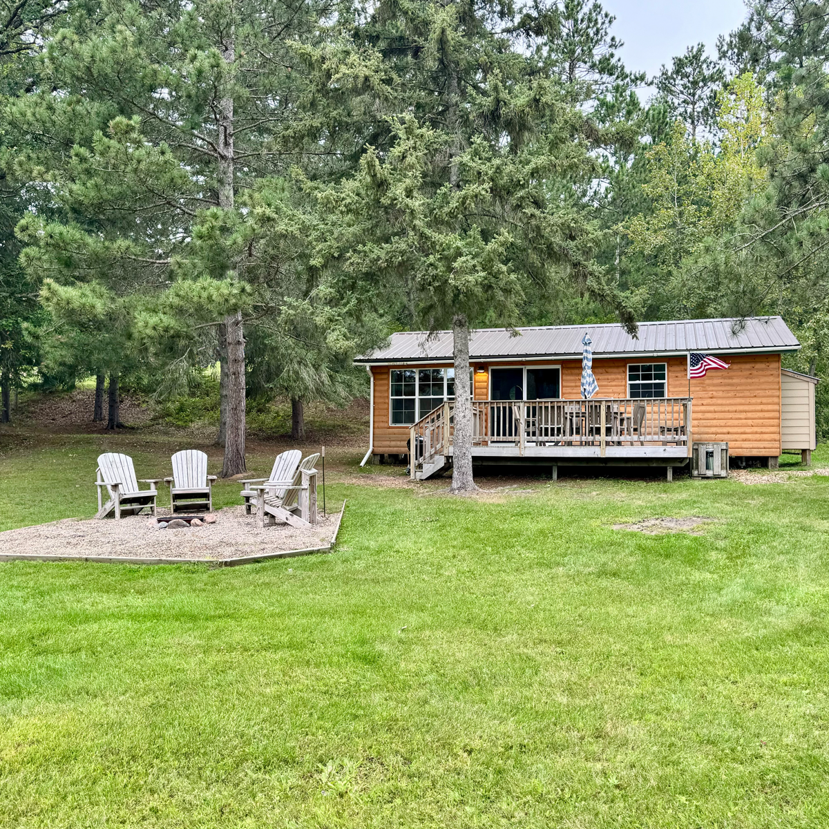 Quiet, secluded, and tucked next to woods, Cabin Six looks out on a nice smooth lawn that leads to the lake.