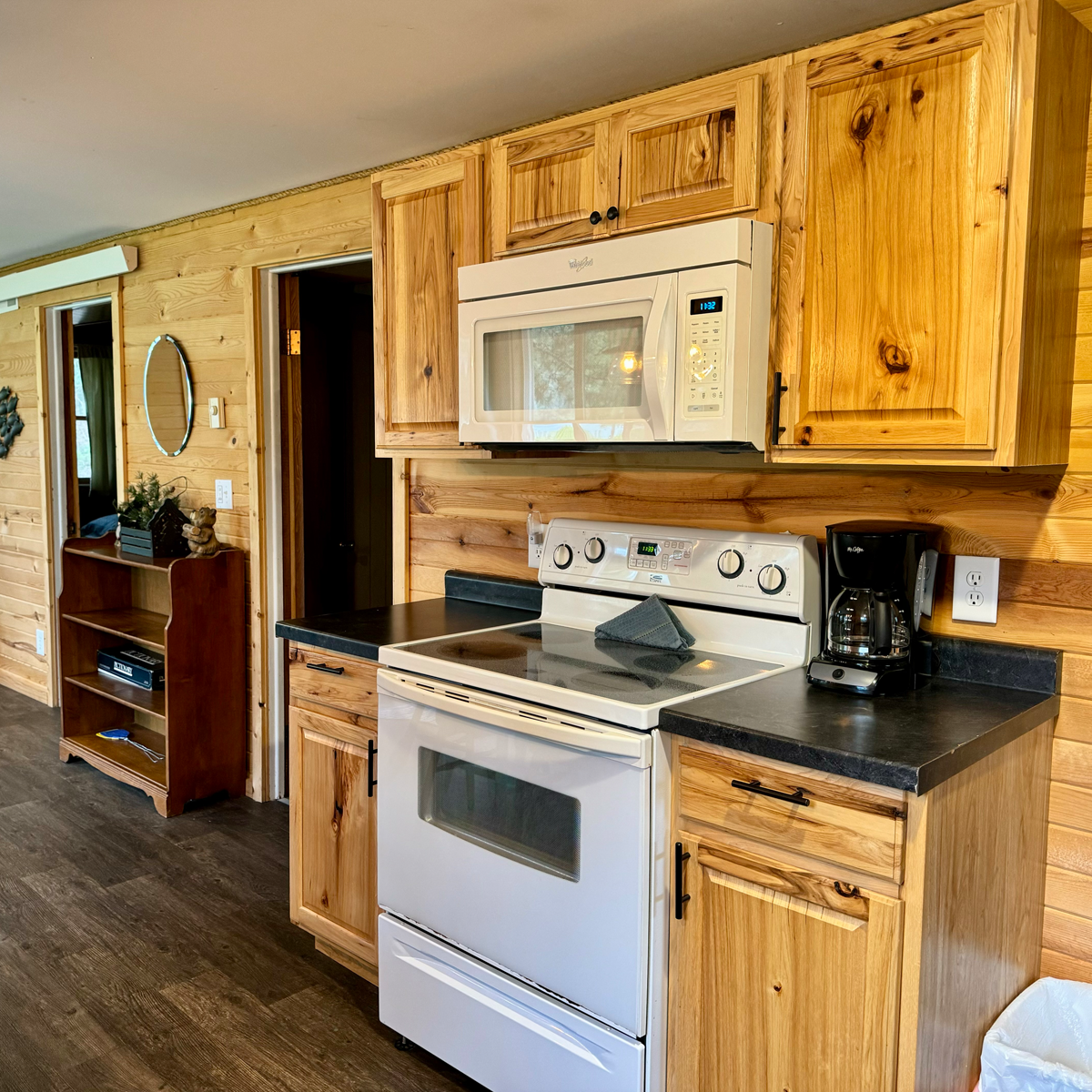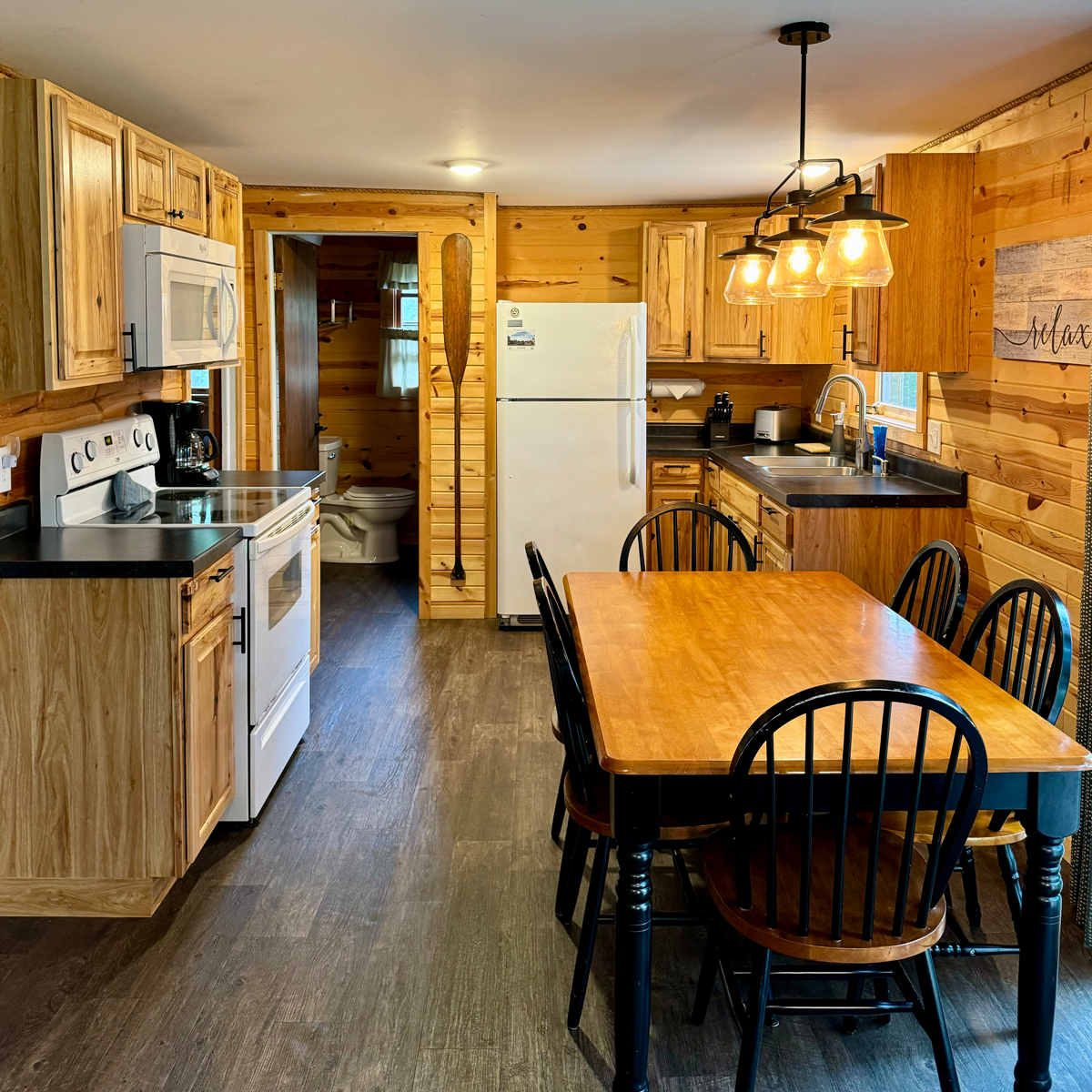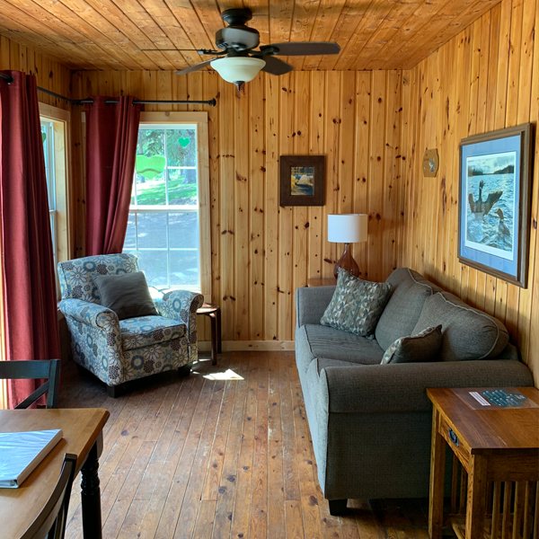 End unit lakefront 3 bedroom (3 queens with linens), 1 bathroom cabin with beautiful views of the north end of the lake. Bathroom with large stand up shower. Full kitchen complete with electric appliances, microwave, coffee pot, dishes, pots, pans, and utensils. Hide-a-way bed in living area. Knotty pine and paneling interior. Radiant heaters provide warmth for chilly days and nights. Sliding glass door to deck. Spacious deck with table and chairs. Windows provide stunning scenic views of the lake, marsh, and lady slippers in the spring. Personal fire ring and charcoal grill.