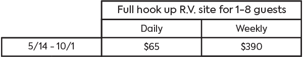 We have 27 seasonal sites. These R.V. sites have full hook ups (water, electricity, sewer), and personal fire rings. Please call for details or to be added to the Seasonal R.V. site waiting list. Rates are based on individual contract. Internet included.