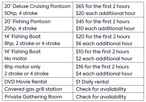 Unlock endless fun in the sun with our resort’s array of water activities! Enjoy paddle boards, kayaks, canoes, and paddle boats, complete with life jackets, all included. Take a leap off our floating raft or bounce around on the water mat. Have a boat? Dock space is available. Cast a line or test your water skiing skills. Take adventure to the next level with our Pontoon rental for cruising or swimming and fishing boat for casting out a line.